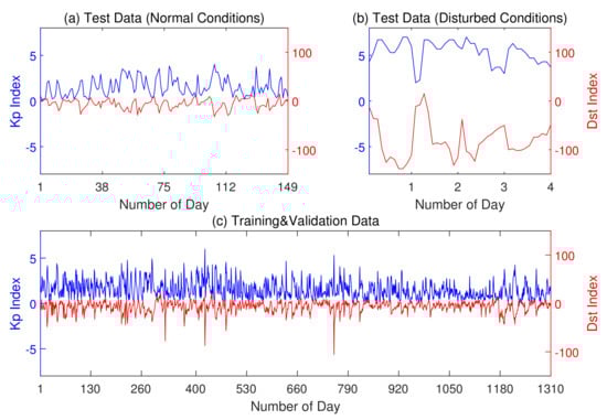 This study tested 3427 data points (23 per day at every hour except on 24 of 149 days) from January to May 2021, when the ionosphere was under normal conditions. The study also tested 44 data points (11 per day at every even hour except on 24 of 4 days) from 15 July 2012 and 17 March, 1 June, 29 June 2013, when the ionosphere was under disturbed conditions. Moreover, the ANN was trained and validated on 30,130 data points (23 per day at every hour except on 24 of 1310 days) from 2016 to 2020. Test, training, or validation data do not overlap on the timeline, which maintains the independence of the experiments. Figure 2 presents the Kp and Dst indices of selected days for training and testing. Table 1 shows the detailed data available by month.