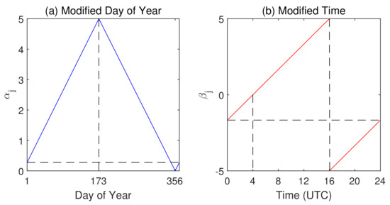 Modification function of feature and . (a) The variation in feature as a function of day of year; peak appears on day 173 when subsolar point is on Tropic of Cancer; a trough on day 356 when subsolar point is on Tropic of Capricorn. (b) The mapping rule between UTC time and feature ; 4 o’clock UTC, when noon is at , is matched to zero; at 16 o’clock UTC, when midnight is at , reaches peak and goes back to trough.