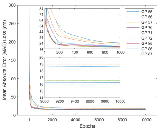 where , which is mentioned in Equation (21), represents the j-th output of the network, and is the corresponding reference. represents the batch size in each iteration. As long as GPU memory is available, batch size could be set to the dimension of the entire training data, i.e., 26,703.
