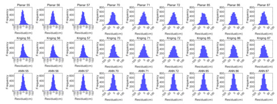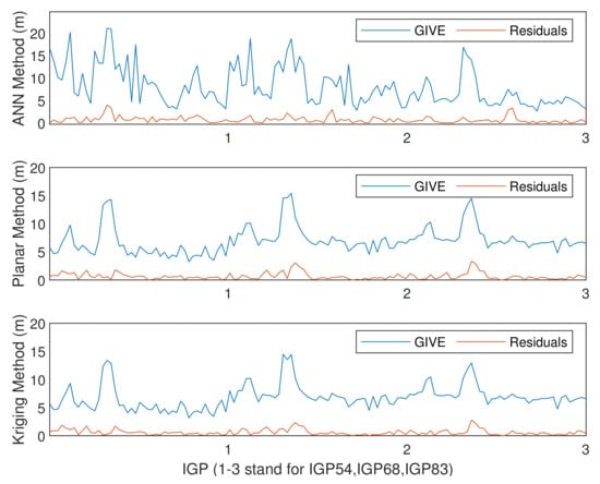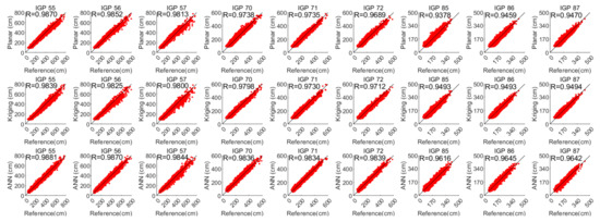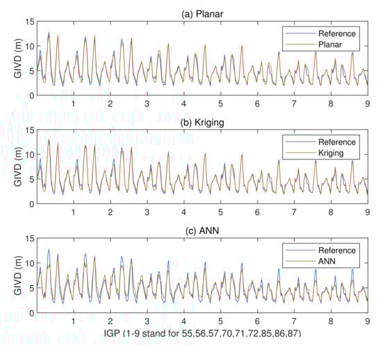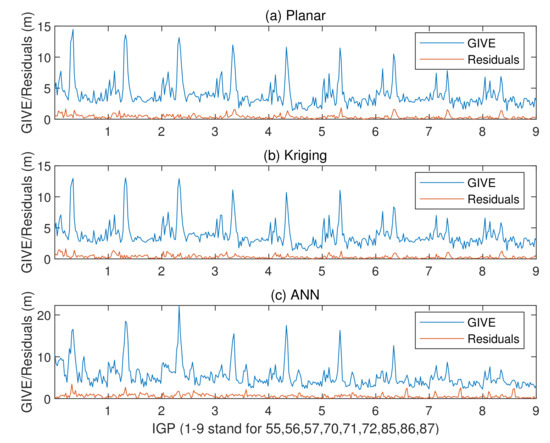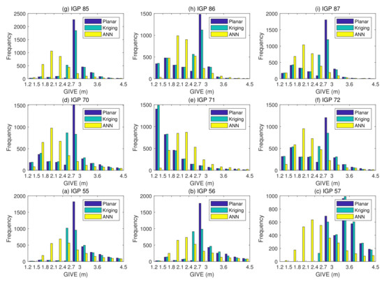 Combining Figure 12 and Figure 13, it could be found that on most IGPs, the ANN GIVE method provides smaller error bounds than other methods. In addition, IGP 71 has perfect IPP distributions in most cases. Therefore, the GIVEs derived by the planar fit and Kriging methods are better than the ANN method.
