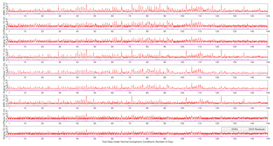 In this part, the resolvent of GIVDs and GIVEs by applying the ANN method for insufficient IPPs is given. IGPs 54 (25°N, 110°E), 68 (30°N, 105°E), and 83 (35°N, 105°E) that are distributed on the edge of the selected station network region are tested. Based on historical data, the minimum number of available IPPs around IGP 54 is 25, by applying the search algorithm proposed by Sparks [20]. The minimum numbers of available IPPs around IGP 68 and IGP 83 in history are 20 and 15, respectively.