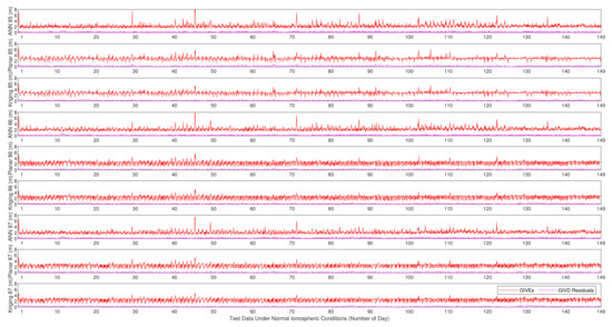 Due to the small amount of test data under disturbed conditions, reference prediction figures and residual histograms are not convincing. Therefore, we just put forward the figure of predicted GIVDs by various methods as well as their references, data point by data point. Residual indicators MAE and RMSE are presented in tables. Figure 14 shows the predicted GIVDs by multiple methods and the CODE GIM references of each data point. Table 5 records the resulting MAE and RMSE of the fitting residuals under disturbed conditions by applying various methods.
