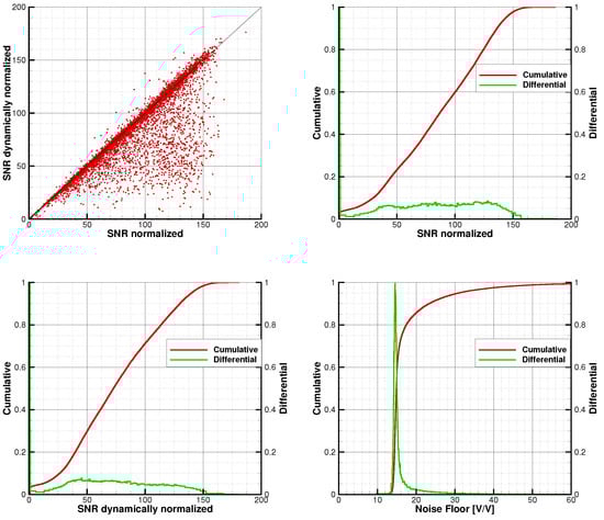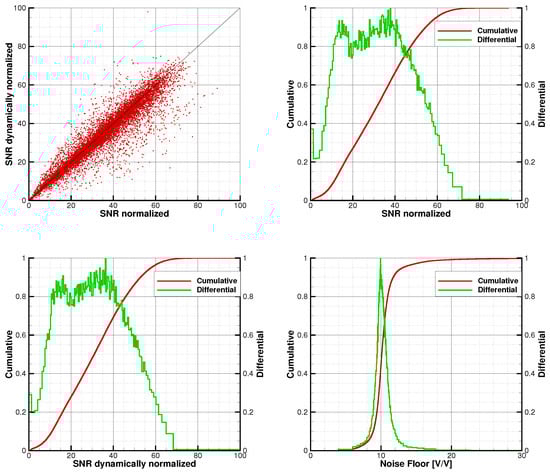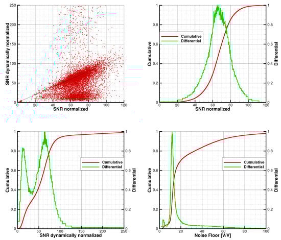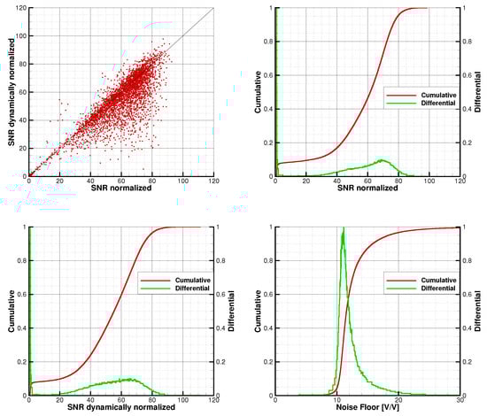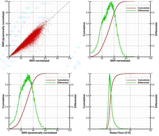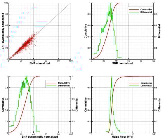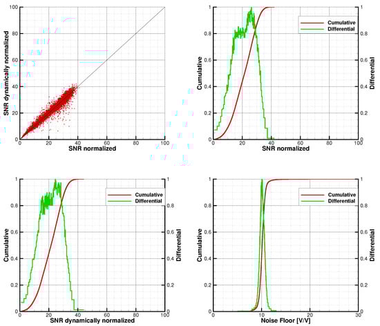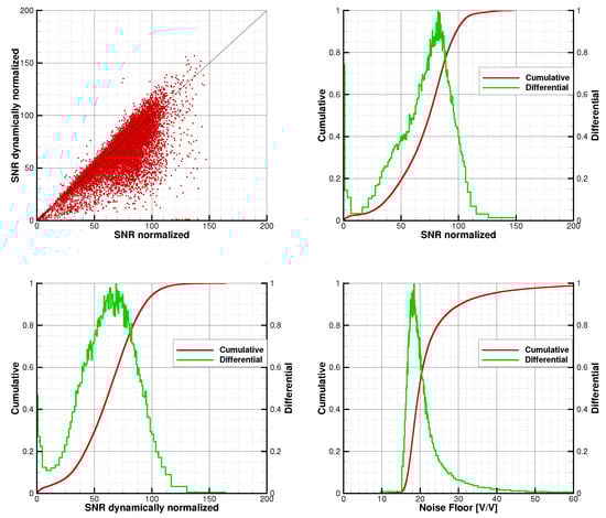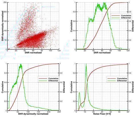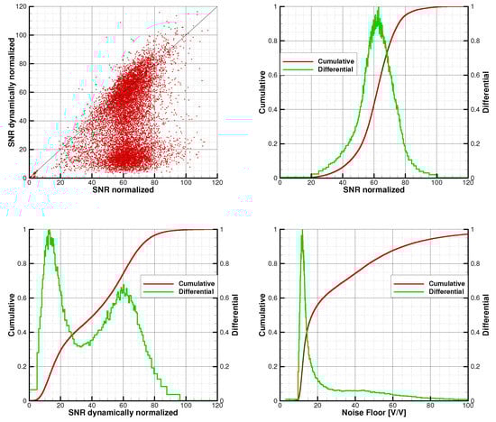 Using the values of NF, which can be both dynamical, i.e., evaluated for the specific RO event, and most probable, i.e., evaluated from the distribution for the specific mission and constellation, it is possible to define two normalizations of the SNR: (1) dynamically normalized, which is defined as the ratio of SNR in V/V and the dynamic NF, and (2) normalized, the ratio of SNR and the most probably NF.