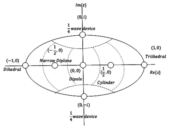 The complex vectors  and the corresponding values of  for symmetric elementary scattering types are given in Table 1. The range of  parameter implies that the scattering matrix can be represented by a point on the unit disk of the complex plane. The position of the various types of elementary scattering mechanisms are shown on the unit circle represented in Figure 1 along with the regions on the unit disk which are considered as belonging to these scattering mechanisms. Evidently, and according to the values of  given in Table 1, all elementary scatterers lie on the diameter of the unit disk except for the ¼ wave devices which lie on the imaginary axis [].