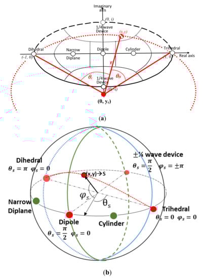 Cameron et al. in [] noticed the need for a closed surface rather than the disk, because of the double presence of ¼ wave device. Ideally, the symmetric space could be the unit sphere, formed by joining the unit disc at conjugate pairs along the rim of the disk. This was thoroughly demonstrated, by a mapping procedure proposed in []. This mapping procedure is depicted in Figure 2a,b. Specifically, in the new topology they associated each point  of the unit disk with a circular arc  on the unit sphere containing the points ,  and .