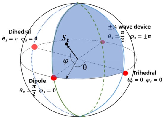 Accordingly, since the scattering mechanism of a cylinder is a mixture of Trihedral and dipole and the narrow diplane scatterer is composed of dihedral and dipole we can assume that the primary elemental scatterers are the four, namely: the trihedral, the dipole, the dihedral and the ¼ wave device as shown in Figure 4. This claim led us to disregard the scattering mechanisms of cylinder and narrow diplane, as being of minimum importance. Depending on the angle values  of the point under examination, the right-angled spherical triangle to which it belongs is located. Whether it is above or below the equator, one vertex of the triangle will always be the “north” or “south” pole of the sphere and the other two, the nearest scattering mechanisms.