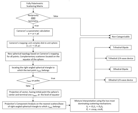 It is noteworthy that the initial determination of the right-angled spherical triangle to which the under-examination scattering mechanism belongs, ensures the absence of undesirable effects such as zeroing the amount of . In the case of , we assume that the scatterer cannot be considered as a mixture of the four primary scatterers and belongs to a class we refer to as “non-categorizable”. The same class is used for asymmetric scatterers.