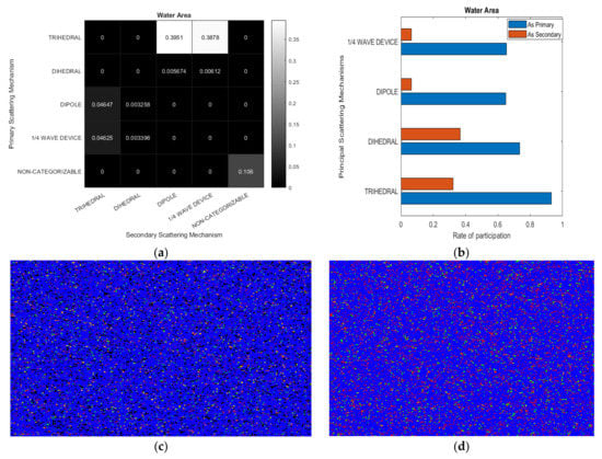 Heatmap (a) of Primary-Secondary scattering pairs and bar diagram (b) with the rate of contribution (strength) either as primary or secondary scatterer for each mechanism in water area. (c). Color Representation of each PolSAR cell using the double scatterer method. (d). Color Representation of each PolSAR cell using the Cameron’s CTD method.