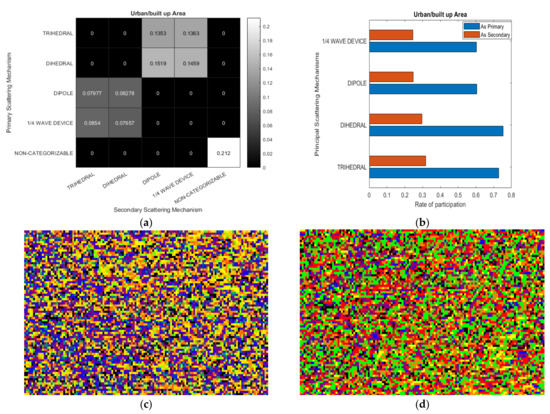 (a) heatmap of primary-secondary scattering pairs and bar diagram with (b) the rate of contribution (strength) either as primary or secondary scatterer for each mechanism in urban/built up area. (c) color representation of each PolSAR cell using the double scatterer method. (d) color representation of each PolSAR cell using the Cameron’s CTD method.