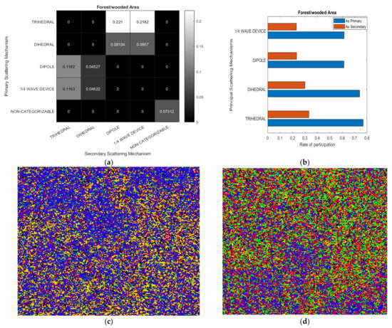 Heatmap (a) of primary-secondary scattering pairs and bar diagram (b) with the rate of contribution (strength) either as primary or secondary scatterer for each mechanism in forest/wooded area. (c) color representation of each PolSAR cell using the double scatterer method. (d) color representation of each PolSAR cell using the Cameron’s CTD method.