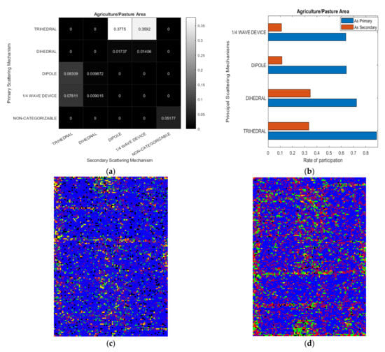 (a) heatmap of primary-secondary scattering pairs and (b) bar diagram with the rate of contribution (strength) either as primary or secondary scatterer for each mechanism in agriculture/pasture area. (c) color representation of each PolSAR cell using the double scatterer method. (d) color representation of each PolSAR cell using the Cameron’s CTD method.