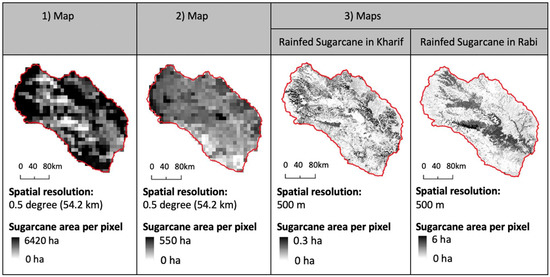 Existing sugarcane maps and data in the region are outdated and contradictory. Publicly available maps are at least 16 years old, making the spatial data outdated. Annual crop area statistics available from the Indian government are spatially aggregated at various administrative levels, so they do not provide detailed spatial distribution of sugarcane. Furthermore, these data sources have contradictions that bring into question their accuracy. For example, there are three main crop maps showing sugarcane in the basin, available from global remote sensing-based projects, but as shown in Figure 2, they are inconsistent. The two maps for the year 2000 from MIRCA2000 [37] and Monfreda’s study [38] show conflicting spatial distributions of sugarcane with different magnitudes. For the year 2005, the GEOSHARE pilot project [39] maps crops by cropping season (Kharif/Rabi/Zaid) and irrigation status (rainfed/irrigated), but the values contradict the typical growing cycle and water requirements of sugarcane in the basin. Although sugarcane is a perennial crop and grown throughout the year, GEOSHARE’s maps show sugarcane in different areas in different seasons in the basin. Moreover, sugarcane is heavily irrigated all year round in the basin, but GEOSHARE’s sugarcane maps report all of the basin’s sugarcane as rainfed due to lack of irrigation-related data for Maharashtra.