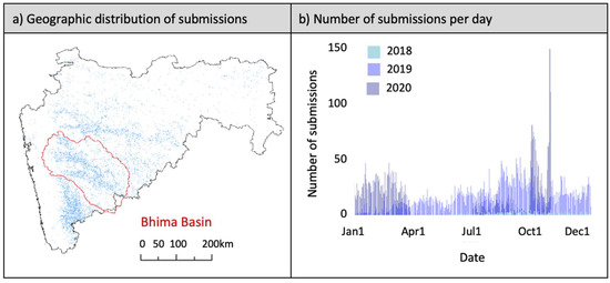 Figure 3. Map and submission times of sugarcane dataset from Plantix. (a) Geographic distribution of farmer submissions. (b) Number of farmer submissions per day from 1 January 2018 to 31 December 2020.