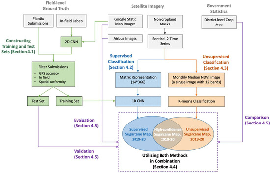 Figure 4. Research design for sugarcane mapping for 2019–2020. We utilized satellite data and novel farmer-crowdsourced geolocated crop data based on a mobile-phone app called Plantix and used both supervised machine learning (a neural network) and unsupervised classification methods individually as well as in combination.