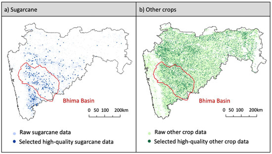 India is the second-largest producer of sugarcane in the world, and it produced 405 million metric tons (19.7% of the world sugarcane crop) over an estimated area of 51 million ha in 2019 [1]. Sugarcane plays an important role in the country’s economy and water–food–energy security [2]. In Maharashtra, which produced 21.5% of sugarcane in India in 2019–2020 [3], water-intensive sugarcane irrigation has depleted freshwater resources and restricted irrigation of more nutritious crops [2]. An accurate recent sugarcane map is a key to assessing the impact of sugarcane cultivation on irrigation and designing targeted agricultural policies, but such a map is not available. Although there are a few existing sugarcane maps for India from global remote sensing-based projects, we found that these maps are outdated and inaccurate (see Section 2.1). The Government statistics on sugarcane area exist up to recent years, but the data are spatially aggregated and there are concerns about their accuracy [4,5,6,7]. In this study, we aimed to produce a 2019–2020 sugarcane map and estimate the sugarcane area in the Bhima Basin, which is a major sugarcane producing region in Maharashtra.