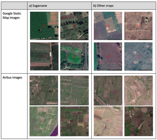 Figure 7. Comparison of Google Static Map and Airbus images of the Plantix data points for (a) sugarcane and (b) other crops (example images). Sugarcane tends to show distinguishable features such as a lush green color and particular texture. The Sentinel-2 pixel that includes the Plantix data point is shown in a red box.