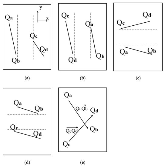 Figure 4. Five different situations when judging the crossing of two edges in Image Q: (a–d) are the conditions of quick judgments; (e) shows the condition of an example that needs main judgments. - (ii)