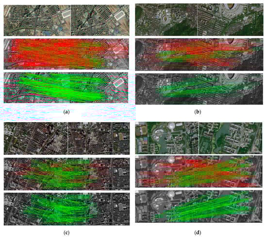 Examples of mismatching removal results in different conditions: (a) an example of an urban landscape; (b) an example of a lake; (c) an example of farmland; (d) an example of a mountain. In each subfigure image, there are 3 images: the top one shows the origin images, the middle one shows the feature matches before removal, and the bottom one shows the matches after mismatching removal.