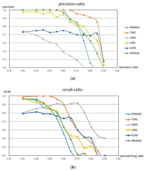 Figure 8 presents the results of the comparisons of different algorithms in terms of the precision, recall, and F-score. The horizontal axis represents the ratios of the mismatches, which ranged from 30 to 90%.