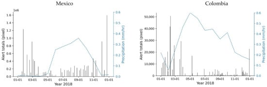 From the historical observations for 2018 in the study area, the change detection identified 1,200,000 deforestation pixels in Manantlán and 50,000 in Cartagena del Chairá. In the Manantlán window area, deforestation events mainly happened in the dry season between December and March (Figure 3, Mexico).