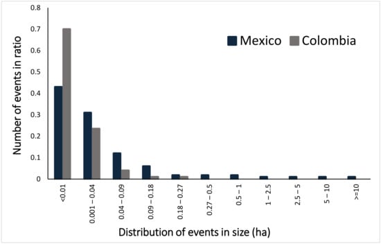 The proportional size distribution of the detected deforestation events for the Colombia and Mexico window areas.