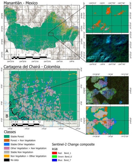 Even though this NRT system recorded change alerts as and when a new image was acquired, in Figure 5 we present the total change for all classes for 2018 in both window areas. In Mexico, most changes occurred near settlements and areas of active land use. We observed changes in regrowth and the loss of vegetation other than forest, as well as deforestation in areas of pristine forest (zoom window in Figure 5A). In Colombia, the study area was not close to big settlements. Therefore, the forest loss occurred in the natural Amazonian forest and the changes in other vegetation classes followed land management practices, such as crop growth and harvesting (Figure 5B).