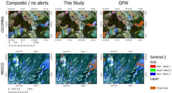 A comparison of PYEO deforestation alerts to Global Forest Watch over two small areas in Colombia and Mexico, showing a color composite of Sentinel-2 data used for the automated change detection in this example from January to December 2018. The color composite has the combination of the earliest acquisition date and the date of change detection. In the Sentinel-2 RGB composite image, red corresponds to the blue channel of the earliest date, green corresponds to the green channel of the latest date and blue corresponds to the red channel of the latest date. On the maps to the left, dark blue corresponds to forest cover loss, while in the center and to the right, forest cover loss detections are overlaid in orange. GFW: Global Forest Watch.