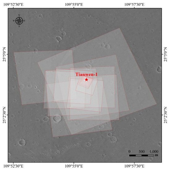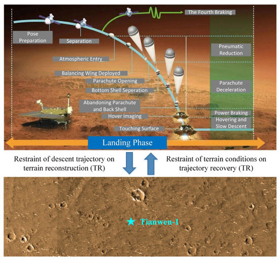 Tianwen-1 is China’s first Mars probe to land successfully [7]. After the lander landed on the surface of Mars (Utopia Plain), the Zhurong rover was planned to complete a series of important tasks of patrol and scientific exploration [8]. A large number of images were acquired by sensors carried on the Tianwen-1 orbiter before landing. The Digital Elevation Model (DEM) and Digital Orthophoto Map (DOM) of the pre-selected landing area were produced based on these images [9,10]. However, the resolution of these terrain products is too low to identify small and easily overlooked ground objects (e.g., rocks, fine trenches, uneven slates) which can be obstacles to the rover’s tour [11]. Therefore, the detailed terrain information near the landing site is necessary for the path planning of the rover [12]. Fortunately, descent images have a higher resolution than orbiter images, which can be used to obtain more detailed digital terrain products [13]. Accurate recovery of the landing camera’s trajectory including position and pose is a prerequisite for generating accurate terrain products based on descent images. In addition, it helps us understand and study the influence of wind on the flight status of the lander [14]. Therefore, trajectory recovery and landing area terrain reconstruction using descent images are the important components of the Tianwen-1 mission, which would guarantee the achievement of scientific goals [15]. Moreover, this work is an essential part of near-surface planetary surveying and mapping.