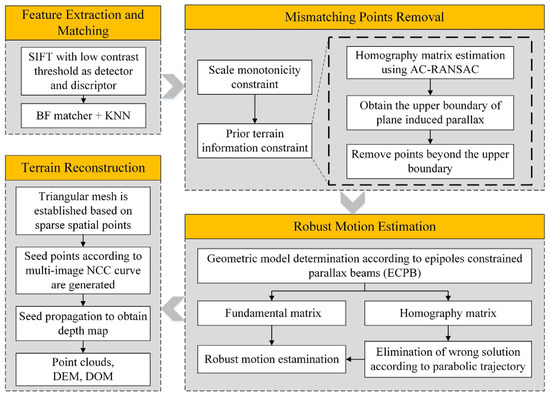 The four main steps of the TR-TR algorithm include feature extraction and matching, mismatching points removal, robust motion estimation, and terrain reconstruction. Details are as follows: