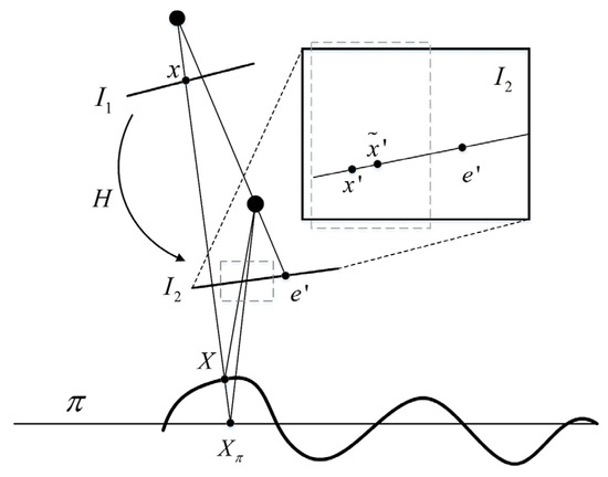 In order to obtain the plane induced parallax of corresponding points, the homography matrix needs to be solved first. The homography matrix computed in conjunction with the AC-RANSAC framework is robust to noise and mismatches [44]. The number of false alarms () is determined by AC-RANSAC as: