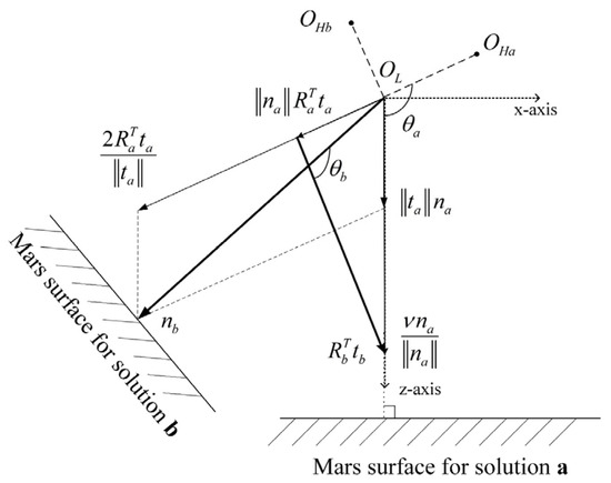 For one descent image pair of Tianwen-1, denoting as the camera center of the image taken at a lower altitude and as the camera center of the image taken at a higher altitude, there are two possible locations of (marked as and ) corresponding to two solutions if the camera is fixed with a view along the inverse direction of the y-axis of the camera coordinate system, as shown in Figure 4. It can be concluded from Figure 4 that the angle between and satisfy Equation (12) when assuming that is in the quadrant ( must be located in the quadrant , since is higher than ):