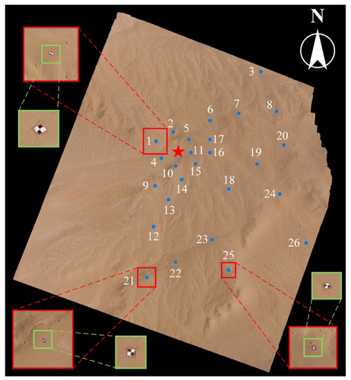 In order to verify the method proposed in this paper, a corresponding field experiment in the Red Cliff area with a Mars-like terrain was designed. The experimental data were captured in November 2019 by the unmanned aerial vehicles (UAVs), DJI Phantom 3 and Phantom 4, during descent when simulating the lander of Tianwen-1, through which far more than 2000 images were acquired. The Red Cliff area is located in the Dachaidan region of Qinghai Province, China. It is the first Mars simulation basement in China and has topographic of great value for studying planetary landforms [46]. Before aerial photography, a number of checkerboard grid plastic boards were deployed as ground control points (Figure 6). The coordinates of the ground control points were measured using the Topcon total station. The true value of the position and pose of the camera corresponding to each descent image were evaluated from the coordinates of the ground control points. In addition to the simulated landing, the UAV flew along multiple airstrips and acquired a large amount of image data which were processed to obtain the true values of the DEM of the experimental area (Figure 7). It can be seen that there are three similarities between the landforms of the experimental area and the landing area of Tianwen-1 (refer to the Tianwen-1′s orbiter image): (1) the terrain is relatively flat (Utopia Plain of Mars); (2) both contain striated feature (sand ridges on Mars); and (3) both contain small areas of obvious topographic relief (impact craters on Mars).