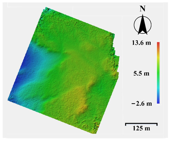 This DEM of the landing area spans about 1600 m in the east–west direction, corresponding to a longitude range of about 2′, and about 1600 m in the north–south direction, corresponding to a latitude range of about 2′, which mainly contains an area of about 1200 m south of the landing site, an area of about 400 m north of the landing site, and an area of 800 m to both the west and east of the landing site. It is demonstrated that the topographic height difference in the area is within 20 m, which implies that the overall topography is relatively flat with lower terrain in the northwest and southeast areas and higher terrain in the southwest and northeast areas. The morphology of the impact crater is mainly represented by a high circular crater lip and a relatively low crater center, according to which several larger impact craters (five located in the western part with one in the eastern part as marked in Figure 20) in the landing area are clearly distinguished in the DEM. In order to evaluate the accuracy of DEM, the RMSE in the vertical direction of the control points was calculated to be 1.612 m.
