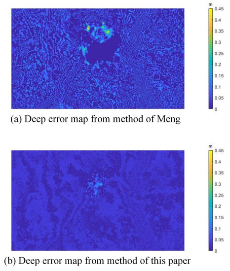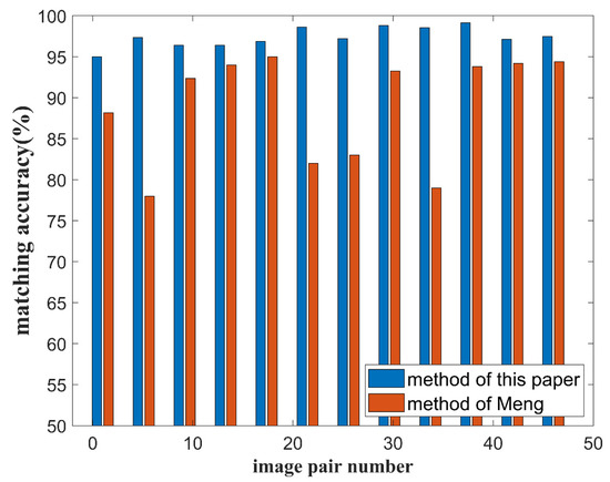 A combination of scale constraints and homography matrix constraints are proposed to eliminate mismatching points in this paper. In the experiment, the true values of the corresponding fundamental matrices can be evaluated based on the true values of the translations and poses of the descent images. It is assumed that the fundamental matrix of an image pair is denoted as . A matching point is marked as on image and on image . The epipolar line through is represented by . Taking the distance from to as a measure, a matching point with such distance less than one pixel is considered to be a correct matching point. The matching accuracy is obtained by dividing the number of correct matching points by the total number of matching points. Twelve out of a total of forty-five pairs were sampled to compare matching accuracy. It is obvious that the matching accuracy of four image pairs obtained by Meng’s method is too low. This is due to the elimination of correct matching points since the incorrect fundamental matrices are evaluated from (quasi-)degenerate data. These phenomena appear randomly among image pairs, whereas the geometric models obtained by the method of this paper avoid this randomness and thus can robustly eliminate the mismatching points. Apart from this, the matching accuracy of the Meng’s method is still not as high as that obtained by the method of this paper. The reason for this is that Meng’s method does not consider using the scale constraint of descent images to eliminate the mismatching points.
