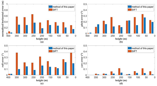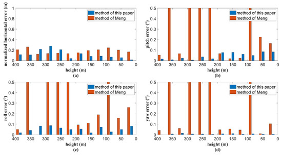 Comparison of the initial motion estimation results of image pairs between the methods of this paper and Meng’s. (a) Comparison of normalized horizontal error. (b) Comparison of pitch error. (c) Comparison of roll error. (d) Comparison of yaw error.