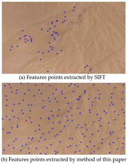 Compared with other operators, SIFT describes the position of points most accurately, which can improve the trajectory recovery accuracy. Therefore, SIFT is selected to extract and describe feature points in descent images. However, the uneven distribution of ground features in the landing area of Tianwen-1 leads to the emergence of large textureless areas in the descent images. Unfortunately, in these textureless areas, SIFT with default threshold in OpenCV (a famous open source computer vision library) is not able to extract sufficient feature points. In order to solve this problem, the contrast threshold of the SIFT operator should be set as small as possible.