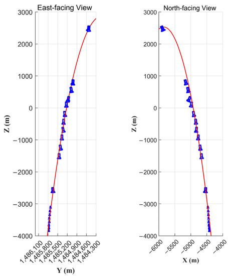 As illustrated by Figure 18, the overall landing trajectory is relatively smooth, except for slight fluctuations in the middle section. During the first half of the descent, the horizontal component of the velocity was mainly pointing from west to east, whereas in the second half of the descent, a slight left turn occurred, after which the direction of the horizontal component pointed from the southwest to northeast. The horizontal interval variation of the camera corresponds to the vertical interval variation of the camera in Figure 17. The V1 and the V12 far away from adjacent images, which is also the same situation in Figure 17. In the final stage of descent, the green dots are densely distributed, no longer turning and oscillating when facing northeast, which corresponds exactly to the way the last few images in Figure 15 overlap.