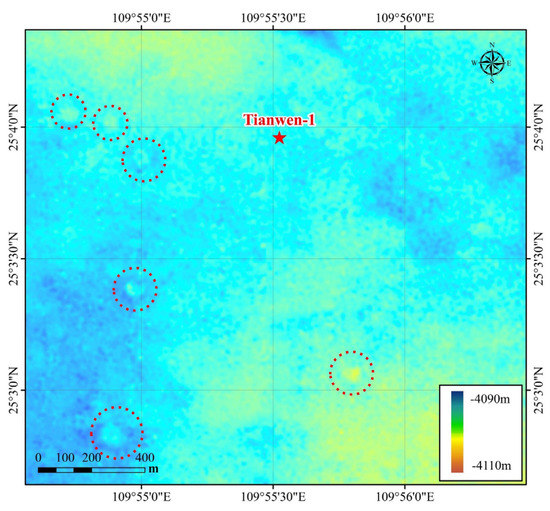 DEM of the landing area of Tianwen-1, and the impact craters are marked as red dashed circles.