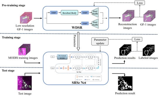 There are two main differences between the proposed SRSe-Net model and the Se-Net model. First, the image after super-resolution through pre-trained WDSR instead of the original image is transmitted to the Se-Net. Second, the segmentation maps of the Se-Net are downsampled to obtain the final green tide extraction results. The overall structure of the SRSe-Net is shown in Figure 4.