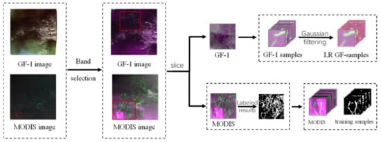 As shown in Figure 5, in the data preprocessing stage, we chose the red and near-infrared bands of the MODIS image with a spatial resolution of 250 m. To fit the sample distribution of the MODIS data during the model training process, we performed the same process for the GF1-WFV image. Two bands of red and near-infrared were selected. The cutting of the selected research area and the interpretation of MODIS images were finished. In the image interpretation process, to obtain a relatively accurate ground truth image, we used the GF1-WFV image data acquired on the same date, similar time, and similar area as the MODIS image for reference. Finally, we cropped the selected study area image and ground truth map to generate training samples, where each small block corresponded to a small truth map. At the same time, we created verification samples and test samples and used Gaussian filters to downsample high-resolution GF1-WFV images to 32 m resolution, generating low-resolution samples for super-resolution sub-model pre-training. In addition, to reduce the impact of data availability, we adopted data enhancement techniques to enrich the training data for segmentation and super-resolution processes.