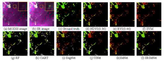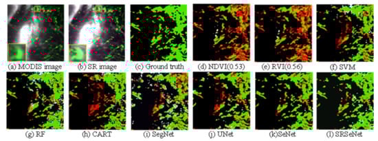 Qualitative results for test image 1. (a) Low-resolution MODIS image; (b) Super-resolution reconstructed image; (c) Ground truth image; (d) NDVI, the best threshold value obtained by the experiment is 0.36; (e) RVI, the best threshold value obtained by the experiment is 0.46; (f) SVM; (g) RF; (h) CART; (i) SegNet; (j) U-Net; (k) Se-Net; (l) SRSe-Net.