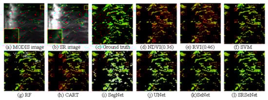 Qualitative results for test image 2. (a) Low-resolution MODIS image; (b) super-resolution reconstructed image; (c) ground truth image; (d) NDVI, the best threshold value obtained by experiment is 0.36; (e) RVI, the best threshold value obtained by experiment is 0.46; (f) SVM; (g) RF; (h) CART; (i) SegNet; (j) U-Net; (k) Se-Net; (l) SRSe-Net.