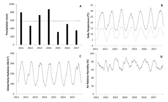 Figure 3 shows the time series of the meteorological variables considered in this study, namely, total annual precipitation (mm) (Figure 3A), average of the maximum and minimum daily temperature (°C) (Figure 3B), average daily global radiation (W·m−2) (Figure 3C) and relative humidity (%) (Figure 3D) recorded at the study site between April 2011 and December 2017. In this period, there were four years (2012, 2015, 2016 and 2017) with total precipitation below the annual average for the study period (592 mm) (Figure 3A).