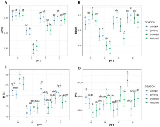 ANOVA for each vegetation indices: (A) NDVI; (B) NDWI; (C) MTCI; and (D) PRI. Average values of VIs (NDVI, NDWI, MTCI, PRI) per PFT (O—cork oak; H—herbaceous vegetation; C—cistus; U—ulex) and season (winter, spring, summer, autumn). Different letters indicate significant statistical differences (p-value ≤ 0.05).