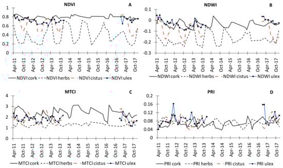 Vegetation indices time series during the study period (2011–2017) for cork oak, herbaceous vegetation, cistus and ulex: NDVI (A), NDWI (B), MTCI (C) and PRI (D). Each point represents the average of 4 replicates for cork oak, 4 replicates for cistus, 4 replicates for ulex and 8 replicates for herbaceous vegetation. Shrubs show a gap in spectral data measurements between 2014 and 2016, due to clear-cutting that occurred in 2014.