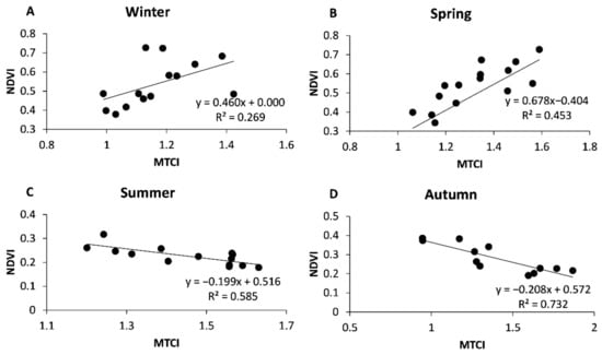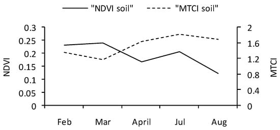 Concerning MTCI, cork oak and cistus showed a larger variability (Table 2). The minimum values of MTCI of cork oak were generally recorded in May, whereas for cistus, the minimum was in July. The maximum value for cork was observed in June, similarly to that observed for the NDVI, whereas the MTCI of cistus reached the maximum values in February. The Ulex airensis registered the highest values in March after it decreased until reaching the minimum in October. Concerning herbaceous plants, MTCI presented an unexpected behavior, as it would be expected that MTCI presented a similar trend to NDVI, because they are indices related to chlorophyll content and the “greenness” of plants, respectively. What we observed in the results obtained for herb NDVI and MTCI values (Figure 5A,C) was that the MTCI of herbaceous plants had higher values in the summer and autumn months than in the winter and spring months, a behavior that did not occur with the NDVI of herbaceous plants. In fact, the NDVI of herbaceous plants presented higher values in winter than in summer, which can be explained by the absence of herbaceous vegetation in the summer season. In order to understand this result and taking into account that, during the summer and fall, an absence of green herbaceous vegetation was observed, we plotted the regression between the NDVI and MTCI of herbs per season (Figure 6), and also evaluated the contribution (inference) of the soil per se (Figure 7) (we measured the reflectance of bare soil separately from the vegetation types over the study period) to the herbaceous NDVI and MTCI results. We designated these outputs as “soilNDVI” and “soil MTCI”. It showed that in winter and spring (Figure 6A,B), these two vegetation indices of herbs followed the same trend. On the other hand, when it comes to summer and autumn (Figure 6C,D), NDVI and MTCI showed the opposite trend, i.e., with MTCI increasing when NDVI decreases.