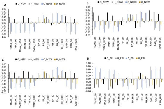 Pearson’s correlation coefficients (r) between vegetation indices NDVI (A), NDWI (B), MTCI (C) and PRI (D) and climate variables (TMAX–maximum temperature (°C); TMIN–minimum temperature (°C); PP–precipitation (mm); RH–relative humidity (%); and RAD–global radiation (Wm−2)), aggregated for different time periods: 30 days (30 d), 90 days (90 d) and the hydrological year (HIDR). Different colors indicate different vegetation type: cork oak (O), herbaceous vegetation (H) and shrubs–Cistus salvifolius (C) and Ulex airensis (U).