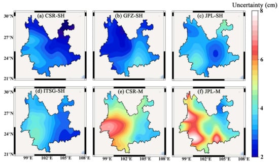 The spatial distribution of uncertainties of TWSC results derived from CSR-SH (a), GFZ-SH (b), JPL-SH (c), ITSG-SH (d), CSR-M (e) and JPL-M (f) solutions estimated by the GTCH method.