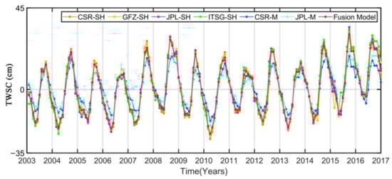 The time-series of TWSC derived from six GRACE solutions and fusion results.