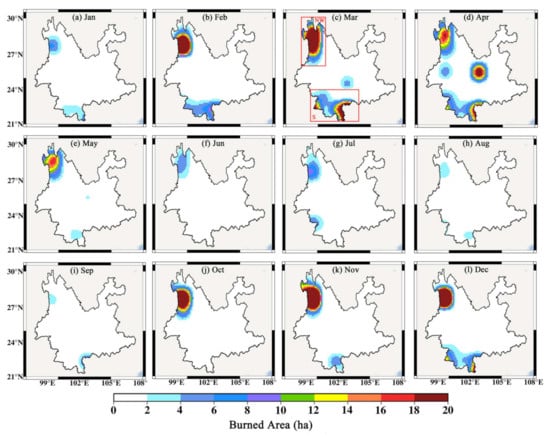 Figure 5 shows the spatial distribution of monthly average burned area from 2003 to 2016 across Yunnan. From the figure, we found that the forest fires were mainly concentrated in northwest (NW), southern (S) and central Yunnan. Among the three regions, the region with the longest forest fire duration and the largest accumulation of burned area is region NW, followed by region S, and finally the central region. In region NW (25°–30°N and 97°–101°E), the high-fire months are February, March, October, November and December and the burned areas in most regions are larger than 18 ha, while the low-fire months are August and September and the burned areas in this region are smaller than 4 ha. In region S (21°–24°N and 98°–104°E), the high-fire months are February, March, April and December and the burned areas in most regions are larger than 4 ha, while the low-fire months are May, June, Auguest and October and the burned areas in most regions are smaller than 4 ha. There were no fires in June or October. In the central region, the forest fires only appeared in March, April and May. The largest burned area occurred in April. Except for the above three regions, there are fewer forest fires in other regions, and forest fires are mainly concentrated in region NW and S. The burned area in region NW is larger than the one in region S. Therefore, we focused on the above two regions in the following research.